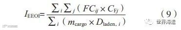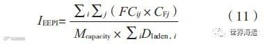 其中:i 为计算周期内的航次号;j 为燃料种类;FCij为在航次i 消耗燃料j 的质量,t;CFj 为燃料j 的碳转换系数,t-CO2/t-Fuel;mcargo为所载货物质量 ( t ) 或所作的功;Dladen,i 为在航次i 与mcargo相对应的航行距离,即载货航行距离,n mile。