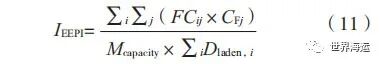 EEPI是张爽提出的营运碳强度指标[8],并被IMO推荐为自愿指标以供船舶试用。计算周期内营运船舶滚动平均EEPI用式 ( 11 ) 表示: