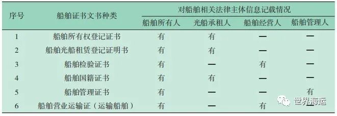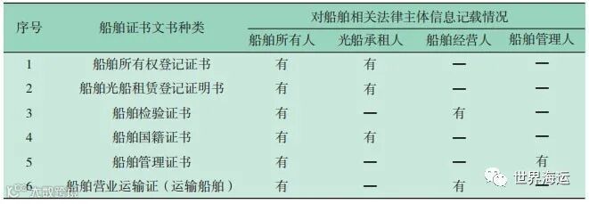 从表2可以看出,船舶所有权登记证书、船舶光船租赁登记证明书、船舶国籍证书的文本和业务系统载明了船舶所有人和光船承租人情况,船舶检验证书、船舶营业运输证的文本和业务系统载明了船舶所有人和船舶经营人情况,船舶管理证书的文本和业务系统载明了船舶所有人和船舶管理人情况。