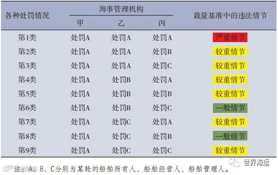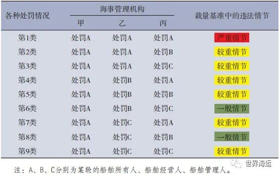 ( 1 ) 船舶所有人、经营人或者管理人为不同主体时,是否存在优先处罚顺序?即什么情况下优先处罚船舶所有人,什么情况下优先处罚船舶经营人,什么情况下优先处罚船舶管理人。例如:按照新《海上交通安全法》,甲、乙、丙3个海事管理机构一年内分别对某轮的同一种海事违法行为,从该轮的船舶所有人A、船舶经营人B或者船舶管理人C中,选择一个作为当事人进行行政处罚时,将出现27种不同组合。其中,在甲海事管理机构确定处罚船舶所有人A的情况下,乙和丙2个海事管理机构在选择船舶所有人A、船舶经营人B或者船舶管理人C进行处罚时,仍然有9种不同组合,如表1所示。《海事行政处罚实施细则》第49条规定,“当事人因同一种海事违法行为一年内受过1次海事行政处罚的”应“按照较重情节进行裁量”,“当事人因同一种海事违法行为一年内受过2次及以上海事行政处罚的”应“按照严重情节进行裁量”。在表1中,将对应出现1种严重情节的组合 ( 第1类 ),6种较重情节的组合 ( 第2、3、4、5、7、9类 ),2种一般情节的组合 ( 第6、8类 )。上述9种不同组合、3个不同处罚裁量标准的出现,显示出执法标准不统一的问题。同时,因处罚的额度相差很大,也将导致船方积极寻求处罚额度最小的第6类或第8类处罚组合,产生滋生腐败和滥用职权犯罪的隐患。