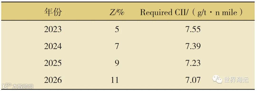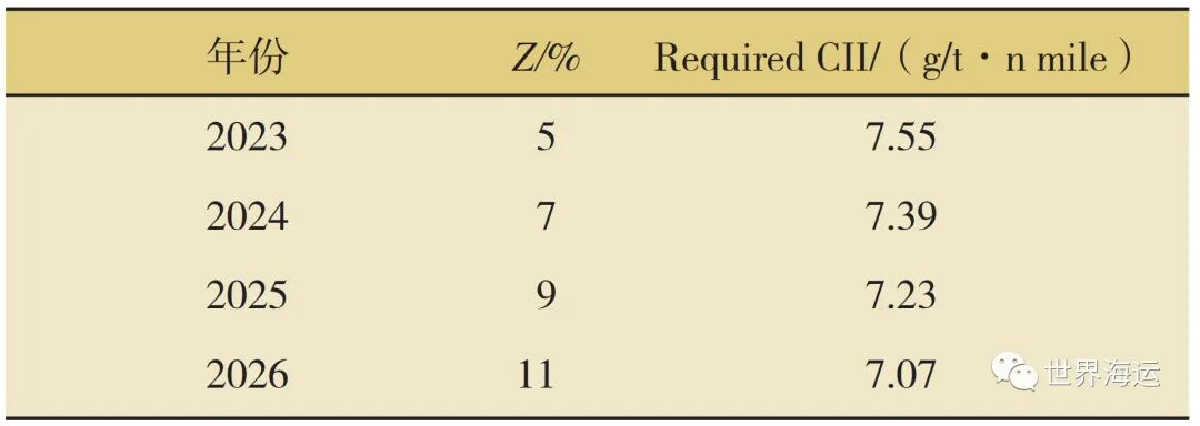 其中:CIIref是由G2导则计算得到的2019年碳强度指标基线值;Z 是折减率 ( 按规定,2023—2026年的Z 值分别为5%、7%、9%、11%,2027—2030年的Z 值将由IMO根据规则的执行效果进一步确定 )。