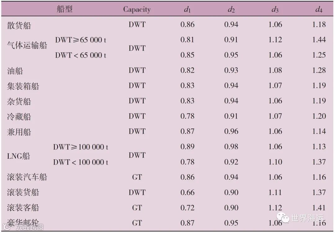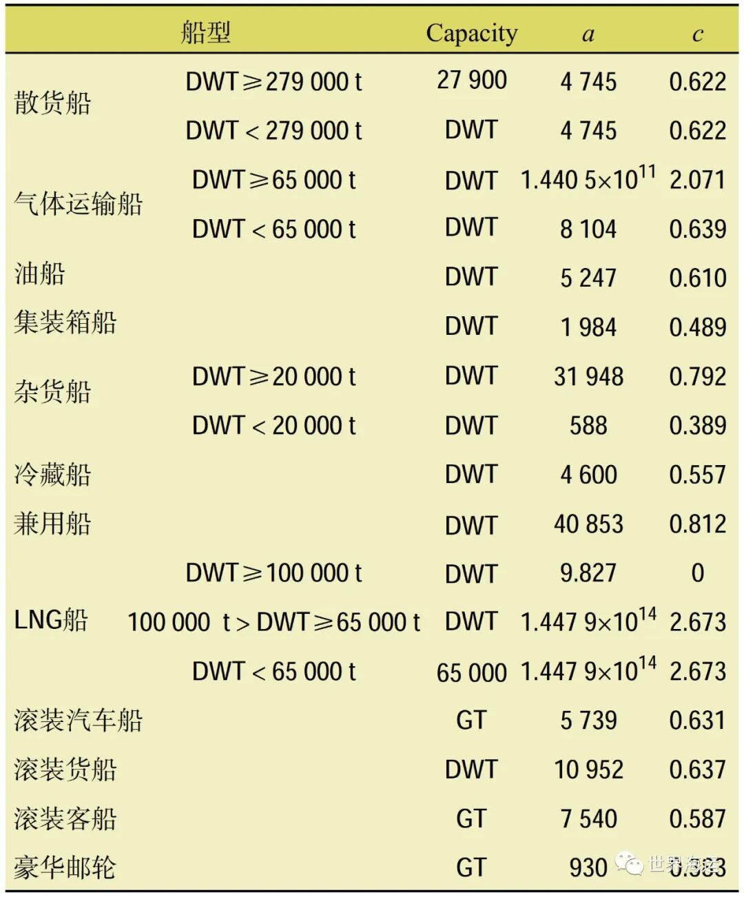 其中:对于包括LNG船在内的大部分船型船舶,C 取决于船舶夏季载重线吃水时的载重量;Dt取决于船舶在IMO DCS中的上报数据。