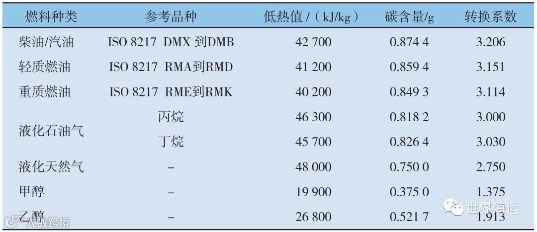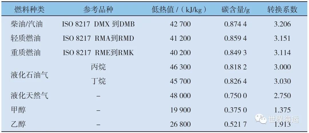 导则给出的常用燃料热值及转换系数见表4。其中,LNG的碳转换系数为2.75,点火油碳转换系数按柴油取3.206。表4非常清晰地表明,作为燃料,LNG热值高于其他品种,但碳转换系数只有2.75,减排效应明显。值得注意的是,甲醇的碳转换系数最小,只有LNG的一半,其热值也最低,只有LNG的41.5%。基于此,人们对甲醇作为碳减排替代能源的有效性存在质疑。因为燃烧热值过低的燃料获得能量,即便燃料本身的碳含量很低 ( 碳转换系数小 ),其消耗量也是非常大的,机器的燃烧效率将难以提高,总的碳排放量不一定降低。