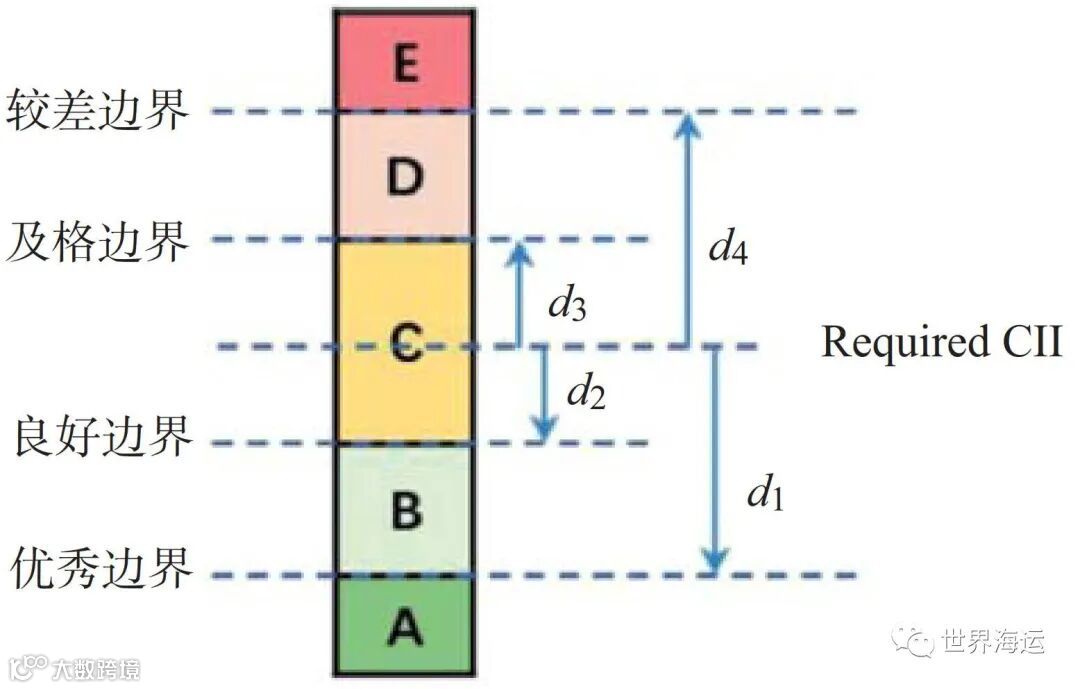 评级边界以2019年碳强度指标基线值为中心,中间的30%区域为C级,然后向上下各划出20%区域为D和B级,最两端各15%区域为E和A级。G4导则中各船型的评级边界线d1~d4取值参见表3。