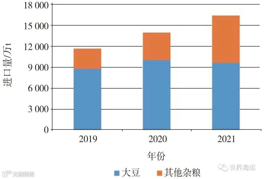 2021年我国进口粮食1.65亿t,较上年同期增长18%,其中大豆进口9 651.8万t,占进口总量的58.6%,同比减少3.8%。除大豆外的其他杂粮进口6 802万t,同比大增71.4%。近几年中国粮食进口情况见图8。