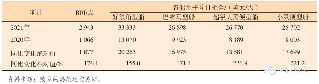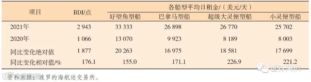 表1 2020—2021年BDI及各船型租金水平同比变化情况