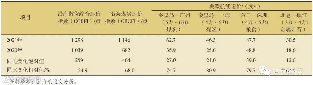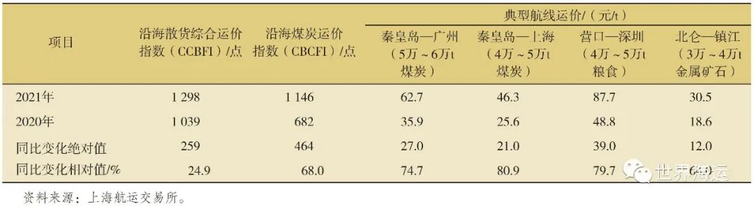 表2 2020—2021年沿海运价指数及主要航线同比变化情况