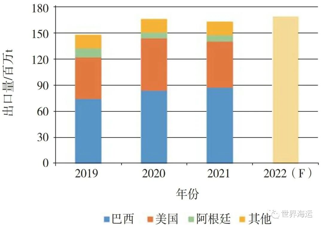 2022年度,全球大豆产量预计总体增长。巴西大豆出口量预计将达到9 200万t,较2021年增长500万t。美国大豆出口量将达到5 780万t,同比增长8.9%。阿根廷和加拿大出口量维持稳定,分别在700万t和450万t左右。预计2022年全球大豆出口量将达到1.69亿t,同比增长4%。近几年全球大豆出口情况及预测见图9。