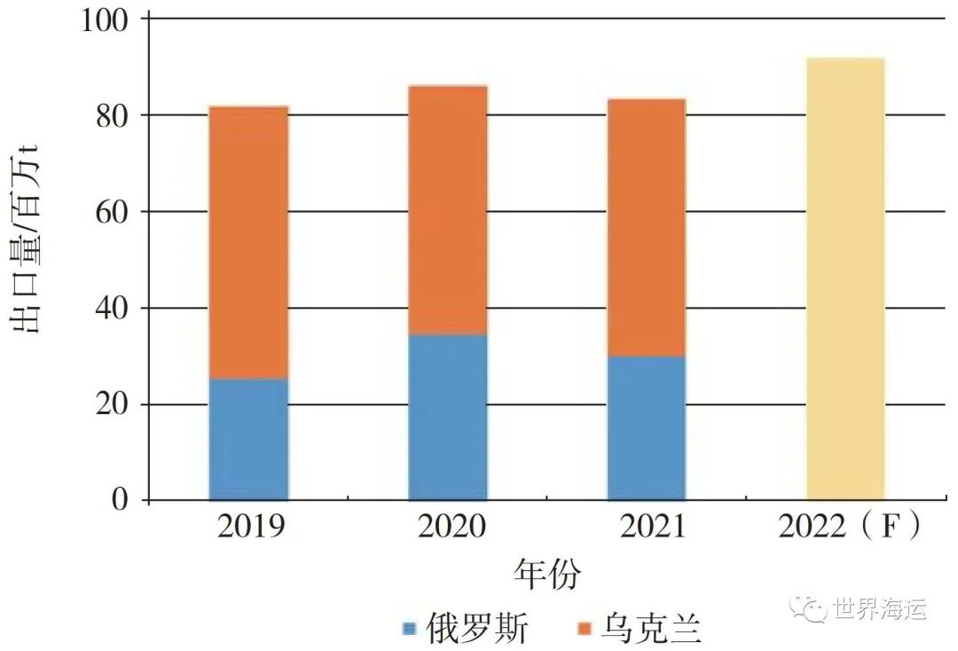 2021年乌克兰粮食产量达到创纪录的1.07亿t,预计2022年乌克兰出口谷物增加6 200万t,增长10%左右,将拉动黑海谷物出口复苏。近几年黑海谷物出口情况及预测见图11。