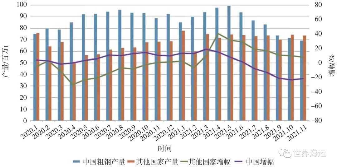 全球粗钢产量保持高产。2021年前11个月,全球主要国家粗钢产量累计为17.5亿t,同比增长4.5%。受中国减产影响,近几个月全球粗钢产量有所下滑,但其他国家的粗钢产量仍保持较快增长。2022年,海外国家钢厂复工复产加快,高炉开工率增加,粗钢产量将保持稳定增长态势。2020—2021年全球粗钢产量变化趋势见图4。