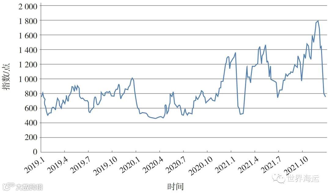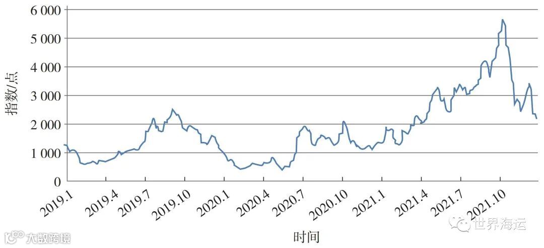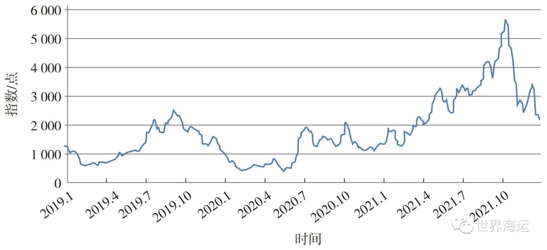 2021年,国际干散货航运市场大幅走高,波罗的海干散货指数 ( BDI ) 在10月上旬达到12年以来最高的5 650点,此后震荡回落。大宗商品价格一路上扬,下游补库积极性高涨,加上全球港口压港严重,市场可用运力不时出现阶段性紧张局面。第四季度,中国限产政策趋严,大宗商品价格高位回落,投机性需求快速消退,干散货航运市场气氛趋于平静。近三年BDI走势如图1所示。