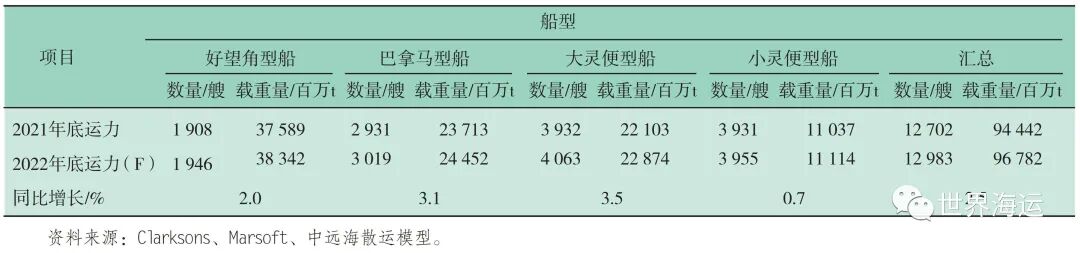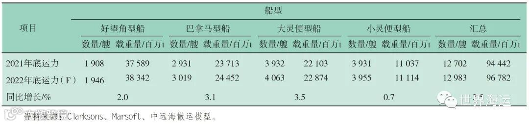 截至2021年底,国际干散货船舶手持订单总计6 500万载重吨左右,按照目前情况估计,到2022年底,全球干散货运力规模将达到9.68亿t,同比增长2.5%,增速比2021年下降1个百分点。2021年底国际干散货运力及2022年底预测见表3。