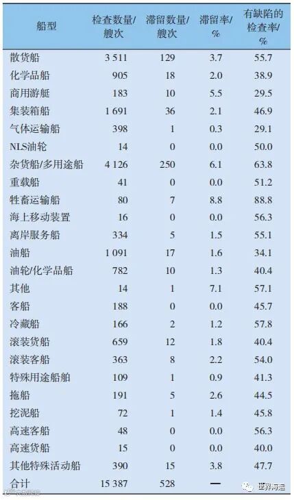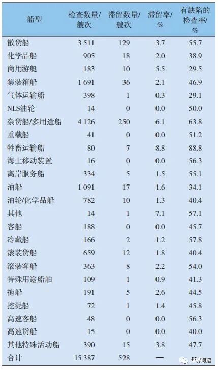 从有缺陷的检查率来看,散货船、杂货船/多用途船、牲畜运输船、滚装客船等都超过了50%,说明这几类船舶在检查中被开具缺陷的概率较高。表3为不同船型的检查情况。