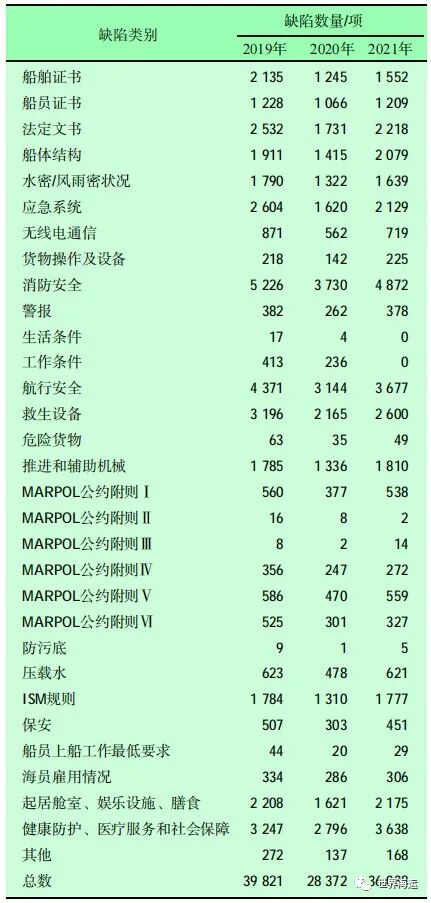 2021年,消防安全、航行安全、健康防护医疗服务和社会保障、救生设备和法定文书继续保持在缺陷数量的前五名。其中消防安全4 872项,航行安全3 677项,健康防护医疗服务和社会保障3 638项,救生设备2 600项,法定文书2 218项,共占所有开具缺陷总数的47.2%。与2020年相比,由于检查数量的增多,绝大部分缺陷数量有所上升。其中,生活条件和工作条件缺陷数量为0,这是因为2021年巴黎备忘录所有成员都已批准生效了《2006年海事劳工公约》( Maritime Labour Convention 2006,MLC 2006公约 ),不再按照《商船最低标准公约》( ILO 147号公约 ) 进行生活条件和工作条件相关检查。值得注意的是,2020—2021年,消防安全、航行安全、健康防护医疗服务和社会保障、救生设备和法定文书类缺陷始终位居前列,说明巴黎备忘录比较重视这些缺陷的检查,也表明公司和船舶对这些缺陷相关的管理如设备维护保养等重视不够。表2为检查的缺陷类别及数量情况。