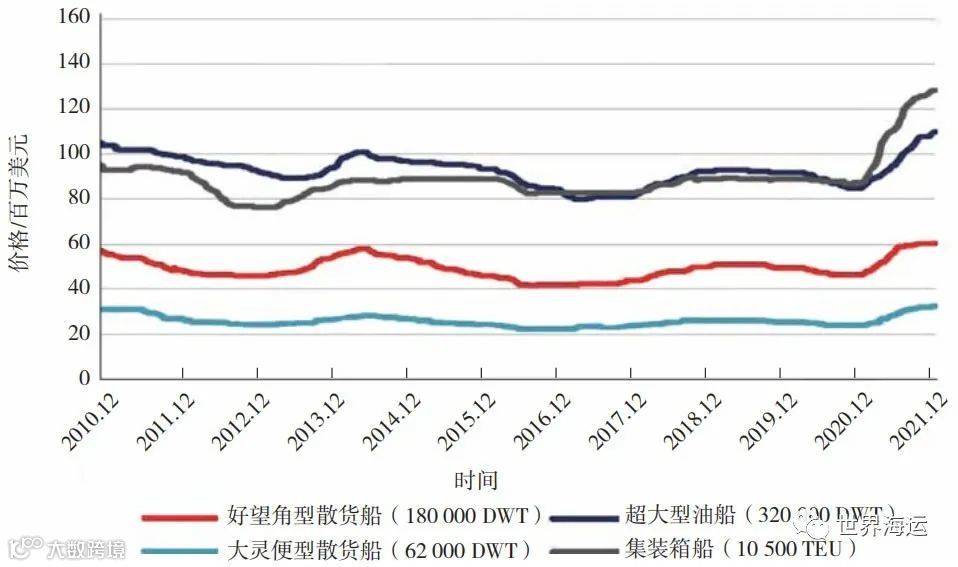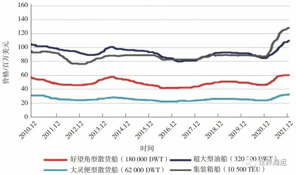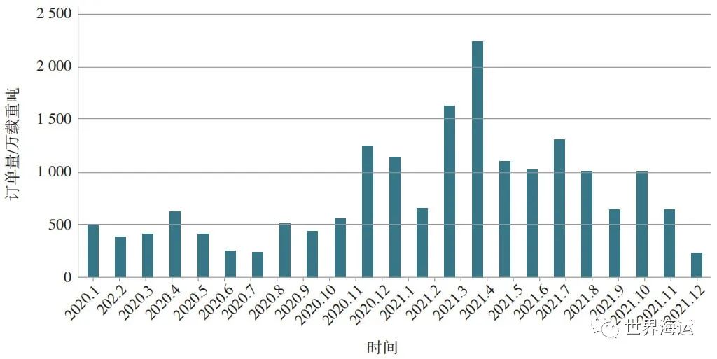 2021年,全球经济复苏带动航运市场回暖,全球海运贸易量同比增速超过6% ( 见图1 ),克拉克森海运价格指数年度增幅超过120% ( 见图2 ),集运市场甚至出现“一箱难求”的罕见景象。航运市场的有利行情传导至造船市场,疫情期间搁置的一批新造船项目得以重启,与此同时,国际海事组织 ( IMO )、国际船级社协会 ( IACS )、国际标准化组织 ( ISO ) 等陆续出台了对航运、船舶的绿色低碳新规则规范,推动了老旧船舶运力的加速更新,进一步激发了船东投资热情,全球新船市场“量价齐升”。中国船舶工业行业协会统计数据显示,全年世界新船订单量累计近1.2亿载重吨,是2020年的2.2倍。2020年以来全球每月新船订单量见图3。主力船型价格涨幅明显,其中好望角型散货船、大灵便型散货船、超大型油船、万箱集装箱船船价较年初分别增长30.1%、35.4%、29.4%和46.9%。这几种典型船型价格变动情况见图4。