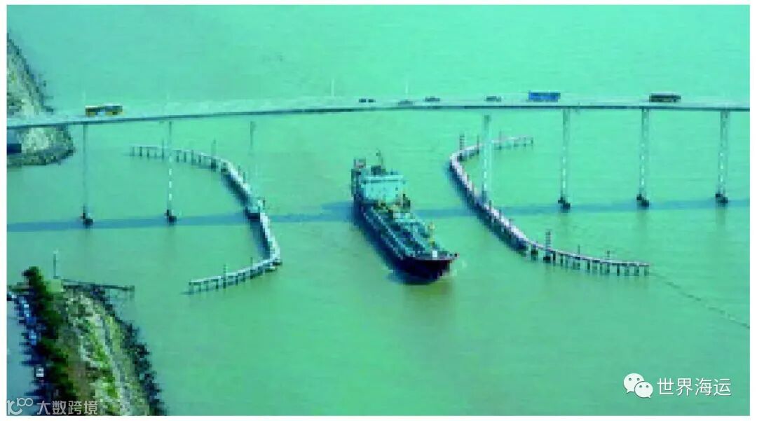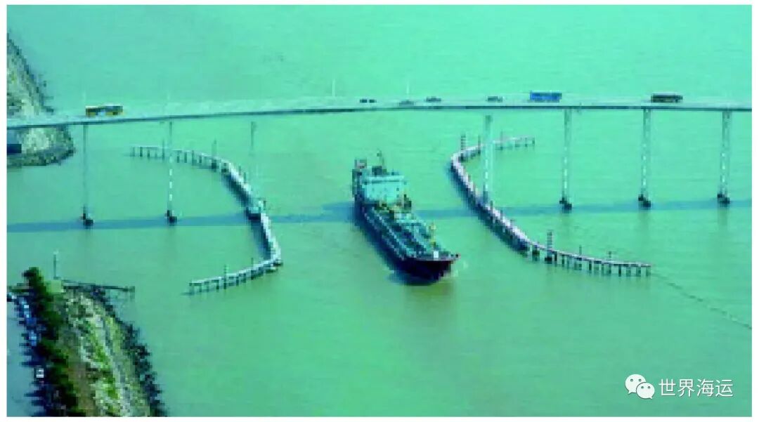那么,是否有办法在船舶撞向桥时阻止船舶触碰桥梁呢?澳门嘉乐庇大桥护桥栏给我们很好的启示,澳门水域多次发生船碰嘉乐庇大桥护桥栏事故,但每次桥梁都安然无恙。中国新闻网2011年3月23日《澳门发生一起货船撞桥事故,大桥未受影响》报道,“据了解,澳门特区政府成立以来,有关部门对护桥栏的设计不断作出改良,在多次的船舶碰撞意外事故中,护桥栏都不同程度发挥了作用,保护了桥梁的安全”。澳门嘉乐庇大桥的护桥栏如同两张弯弓一样保护着两侧桥墩,如图2所示。船舶若直接冲向桥墩,无论哪个方向均会被护桥栏所阻挡;若船舶由于超高或其他原因不能通过桥梁,船长发现后也可通过转向触碰护桥栏而避免触碰桥梁。这样设计是本质安全理论“替代”方法的运用,用护桥栏替代桥梁被撞,从而实现了本质安全。