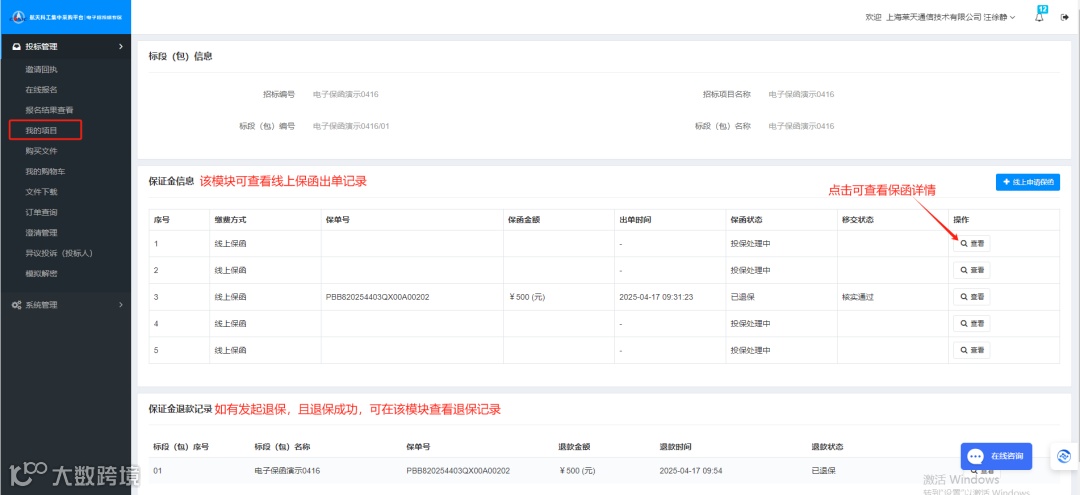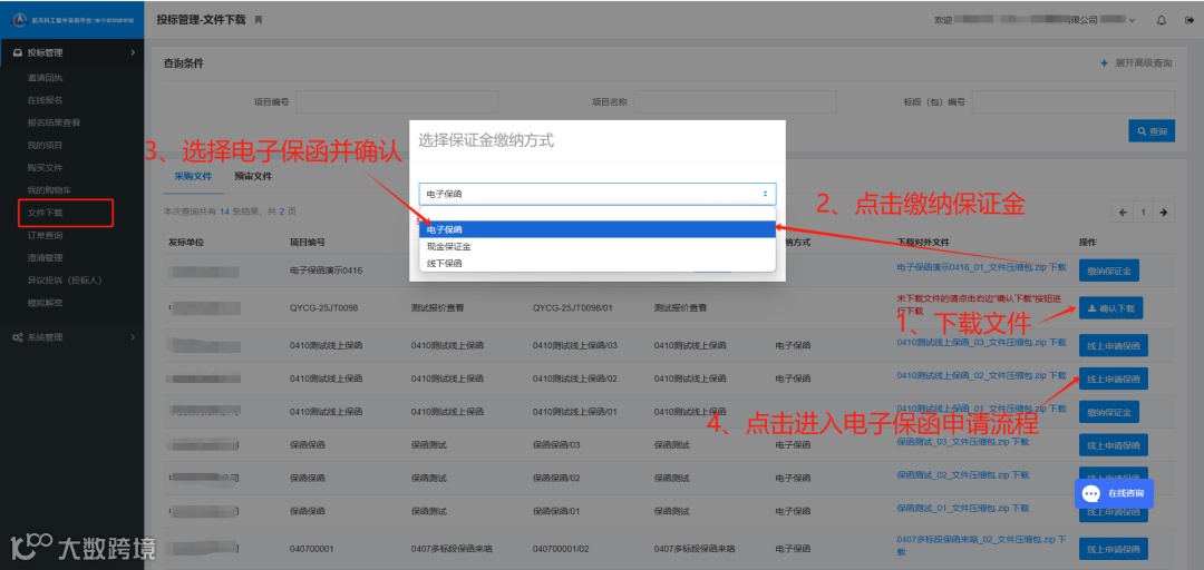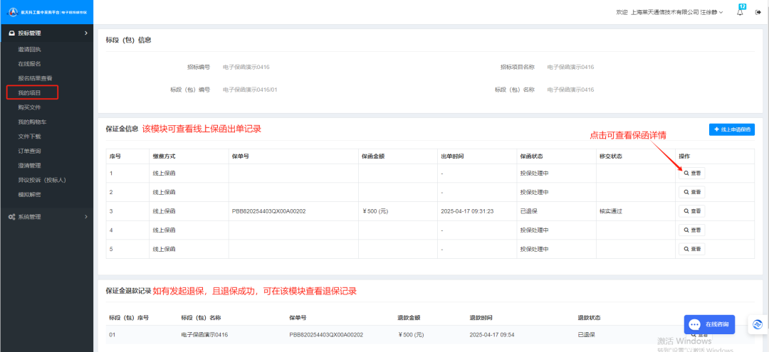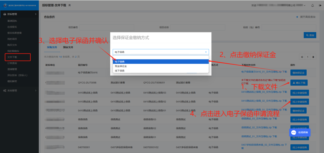 支付成功后,在“我的项目-选定项目-操作-保证金管理-保证金信息模块”查看或下载电子保函及发票。