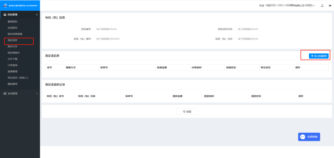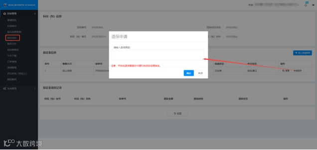 点击“我的项目-选定项目-操作-保证金管理-线上申请保函-保证金信息模块-申请退保“进入操作入口