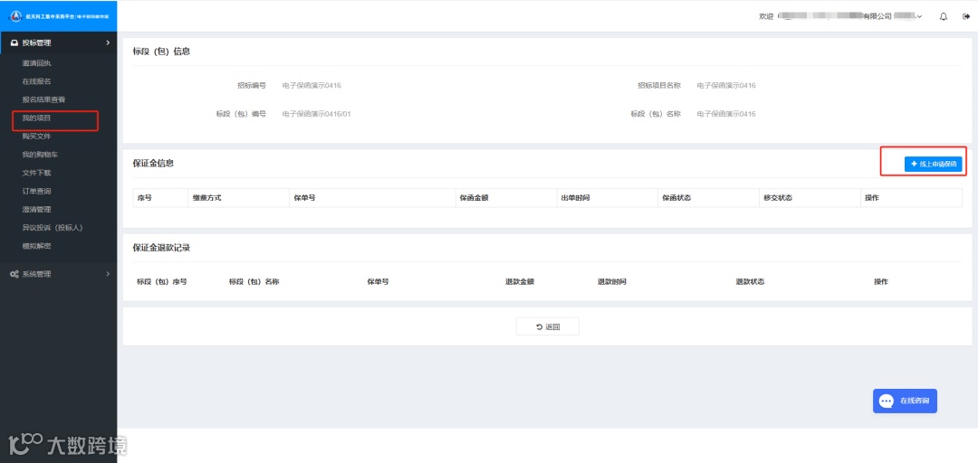 入口2:通过“我的项目-选定项目-操作-保证金管理-线上申请保函”点击申请。