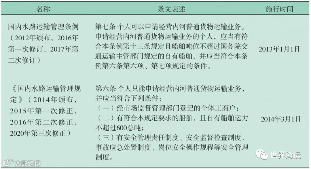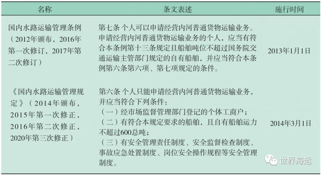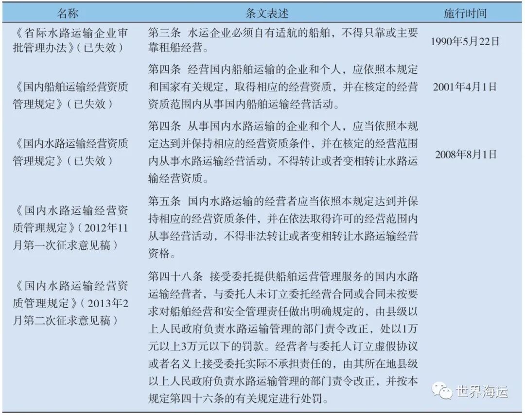 实际上,从2001年开始,原交通部在调研船舶挂靠经营问题后,就发布了〔2001〕360号文(3),要求对所有个体运输船舶经营户 ( 含已挂靠在航运企业经营的个体运输船舶经营户 ) 必须按规定的时间实现企业化经营,但有例外,即经营内河普通货船除外。换言之,所有海运船以及内河危险品船、危化品船、旅客船等都需企业化经营,这从一定程度上解决了海船以及特殊船舶的挂靠现象,但也迫使经营内河船舶的个人不得不去找寻有资质的企业进行挂靠。虽然之后,原交通部又分别于2006年(4)、2008年(5)多次发文,三令五申严禁船舶挂靠经营,但时至今日,船舶挂靠经营仍然是普遍现象。涉及国内船舶运输经营资质的规定如表2所示。