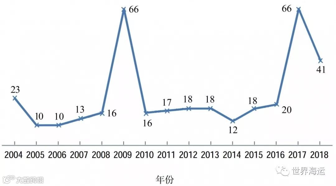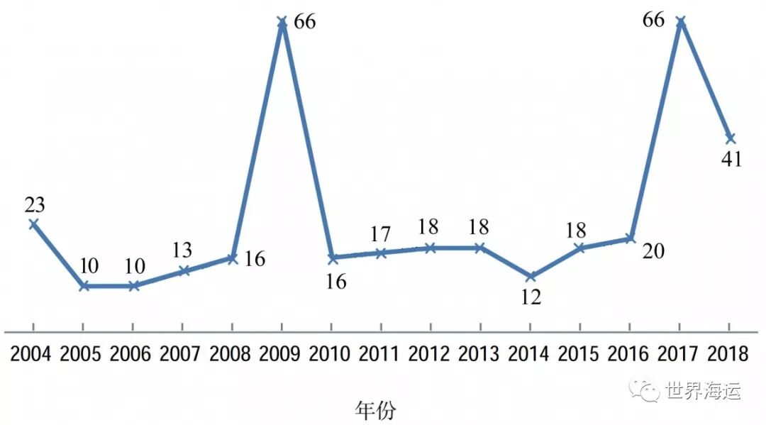 2004年,国际海事组织 ( IMO ) 联合国际劳工组织 ( ILO ) 建立运行海员遗弃案件的国际数据库 ( 以下简称“IMO-ILO数据库”)。各国政府、工会或相关组织可以通过邮件方式报备海员遭遗弃的案件。在最近 ( 2019年3月27日至29日 ) 召开的IMO法律委 ( LEG ) 第106次会议上,法律委讨论了海员遗弃案件数量在增长以及解决这一问题所需精心安排的行动,包括船旗国和港口国合作开展行动。截至2018年12月31日,已有366起遗弃事件被列入该数据库,影响到4 866名海员。这些事件中有175起案件得到解决,77起有争议,52起处理无效,仍有52起未解决的案件。然而,业界和媒体一再表示关切的是,有相当数量的包括长期遗弃案件在内的遗弃案件从未被报告,因此也就没有被列入数据库。[2]图1为被遗弃海员案件数量逐年分布情况。[3]