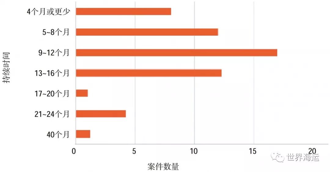 ( 1 ) 遗弃案件的持续时间。最让人关心的是海员在被遗弃的船舶上度过或在等待遣返的时间。因此,需要评估2014修正案的有效性。图2为遗弃案件的持续时间,为了明确所涉时间的长短,图中将未支付工资的期限作为计算遗弃期的纵坐标。造成长期遗弃的原因,主要是正在进行的法律程序导致船舶无法出售或未能更换海员。