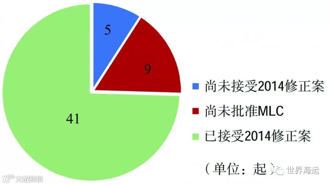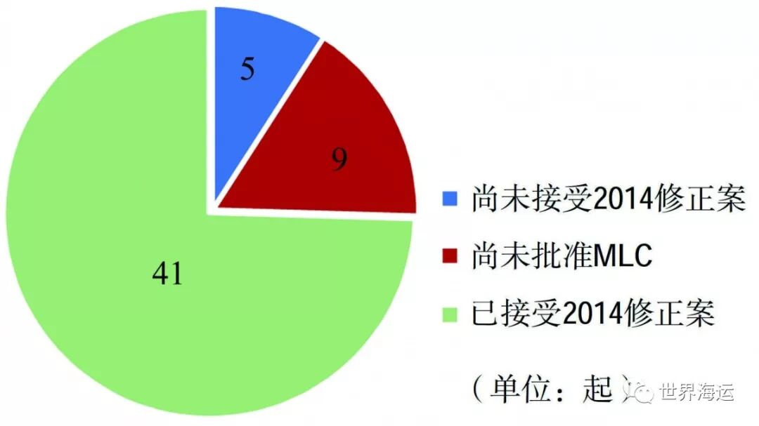 ( 2 ) 是否接受MLC2014修正案。图3显示了在所列的55起案件中是否接受MLC2014修正案的分布情况。可见,41起 ( 75% ) 悬挂已批准MLC国家的船旗,并已接受2014年修正案的生效;5起悬挂已经批准MLC国家的船旗,但尚未表示接受修正案;9起悬挂尚未批准MLC国家的船旗。