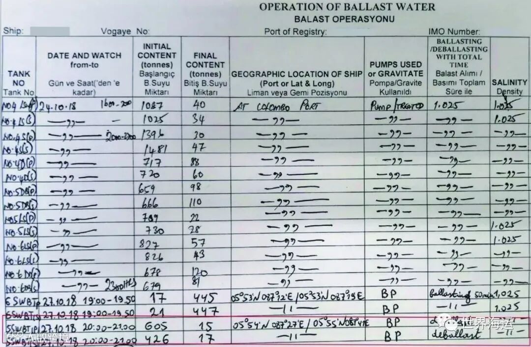2018年10月24日,A轮在COLOMBO港排放经处理压载水,但排放前5DB ( P ) 和 ( S ) 舱内压载水的容量分别为659和666吨,与8月11日的记录不一致。排放后,两个舱剩余压载水各为98和110吨。