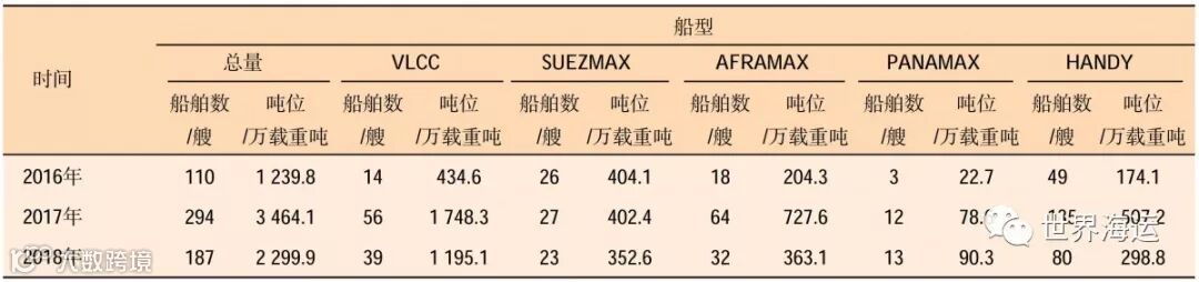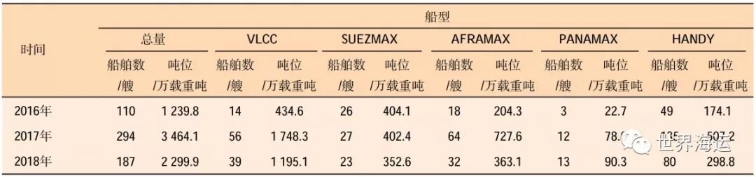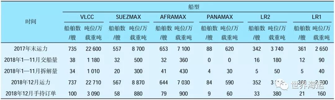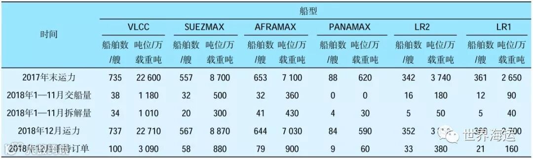 从船队数量看,2018年油轮各船型的运力增长速度比2017年显著降低,新船交付量减少且拆解量有较大幅度上升,前11个月VLCC的拆解量达到34艘,而2017年同期仅为11艘,SUEZMAX、AFRAMAX型油轮的拆解量同比也分别增加9艘和18艘。在低运费、高拆船价、油轮船队的老龄化以及即将生效的硫排放标准、压载水公约等多重因素作用下,2018年第一季度开始,油轮运输市场就形成了完美的“拆船风暴”,从供应过剩的船队中淘汰老旧油轮。根据克拉克森统计数据,至2018年12月,全球油轮船队(万吨以上)总量为6 691艘、58 770万载重吨,与上年同期(6 608艘、58 220万载重吨)相比,船舶数量增加1.26%,总载重吨增加0.94%(上年同期增速分别为3.89%和5.13%)。2018年前11个月VLCC、SUEZMAX、AFRAMAX、PANAMAX以及LR2、LR1等各船型的净增长量分别为2艘、10艘、-9艘、-4艘、10艘、7艘(2017年同期增量为37艘、44艘、8艘、0艘、26艘、14艘),油轮各船型净增长量都低于上一年同期水平。2018年油轮各船型运力增减变化见表3。