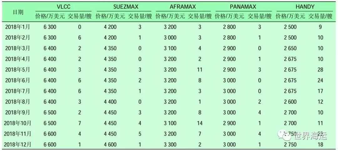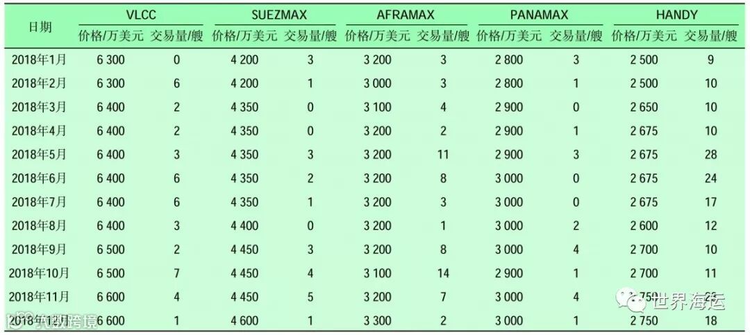 2018年油轮二手市场的成交量同比上升,总二手交易量达到333艘,和2017年同期279艘成交量相比,增加19.35%,二手油轮的价格也普遍上涨。和年初的价格相比,5年船龄的VLCC、SUEZMAX、AFRAMAX、PANAMAX以及MR型油轮的二手价格和年初相比变动幅度分别上涨4.76%、9.52%、3.12%、7.14%和10%。2018年全年VLCC型二手船舶共成交42艘,同比减少1艘;SUEZMAX型船舶共成交23艘,同比减少5艘;AFRAMAX型船舶成交66艘,同比增加29艘;PANAMAX型船舶成交20艘,同比增加7艘;HANDY型船舶成交182艘,同比增加24艘。各船型二手油轮交易价格和交易量见表5。