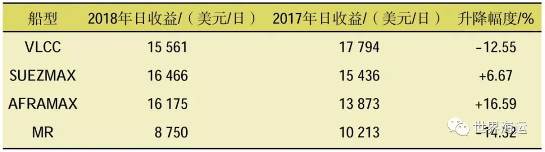 2018年,原油船市场经历了糟糕的一年,OPEC减产和伊朗制裁等地缘事件使得前三季度油价持续走高,中国等主要进口国原油进口增速放缓、委内瑞拉原油出口减少等地缘事件使得原油贸易受到抑制,运输需求疲弱,尽管老旧油轮拆解量达同期历史高位,但市场运价依旧持续在低位徘徊,国际燃料油价格同比提高约28%,市场收益水平降至近20年最低谷。在传统油运旺季的季节性行情刺激下,及此前受抑制的刚需集中释放,四季度运价“超预期”反弹。2018年TD3C运价指数全年平均为WS56.68,最高99.58,最低35.58;该航线全年日收益平均值为18 802美元,最高58 030美元,最低仅为3 859美元。TD15运价指数全年平均为WS56.90,最高99.75,最低37.42。2018年VLCC和MR型油轮的日收益同比分别下降12.55% 、14.32%,SUEZMAX、AFRAMAX型油轮日收益分 别增加6.67%和16.59%,见表1。