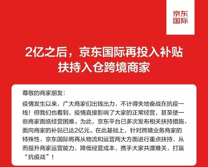 2月11日,针对跨境业务商家的特殊性,京东旗下进口商品一站式消费平台——京东国际宣布将再从物流和运营两大方面进行重点扶持,为京东跨境物流仓配一体服务的商家(SOP入仓商家)提供物流补贴及支持、广告激励金补贴、搜索流量倾斜及精准推荐支持、大促活动及核心频道优先共四项政策激励,提升商家运营能力,降低经营成本,帮助商家渡过难关。