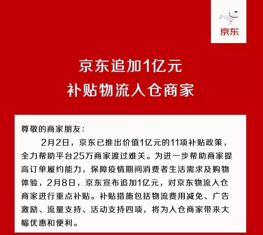 为了在疫情期间进一步帮助商家恢复正常经营,京东在此前投入1亿元扶持平台商家的基础上,近日宣布再追加1亿元,对京东物流入仓商家进行重点补贴。这些措施涵盖了费用减免、金融和物流支持、流量支持、技术支持、健康保障等。其中,针对湖北地区商家,京东还重点提供了有力的扶持,推出了减免平台使用费、赠送保险保障、标签流量支持、延长工具免费使用期限、服务支持等补贴支持措施。目前,京东的情人节大促活动已经开启,京东将利用核心资源流量,帮助更多商家获得更多曝光机会,促进商家销售。