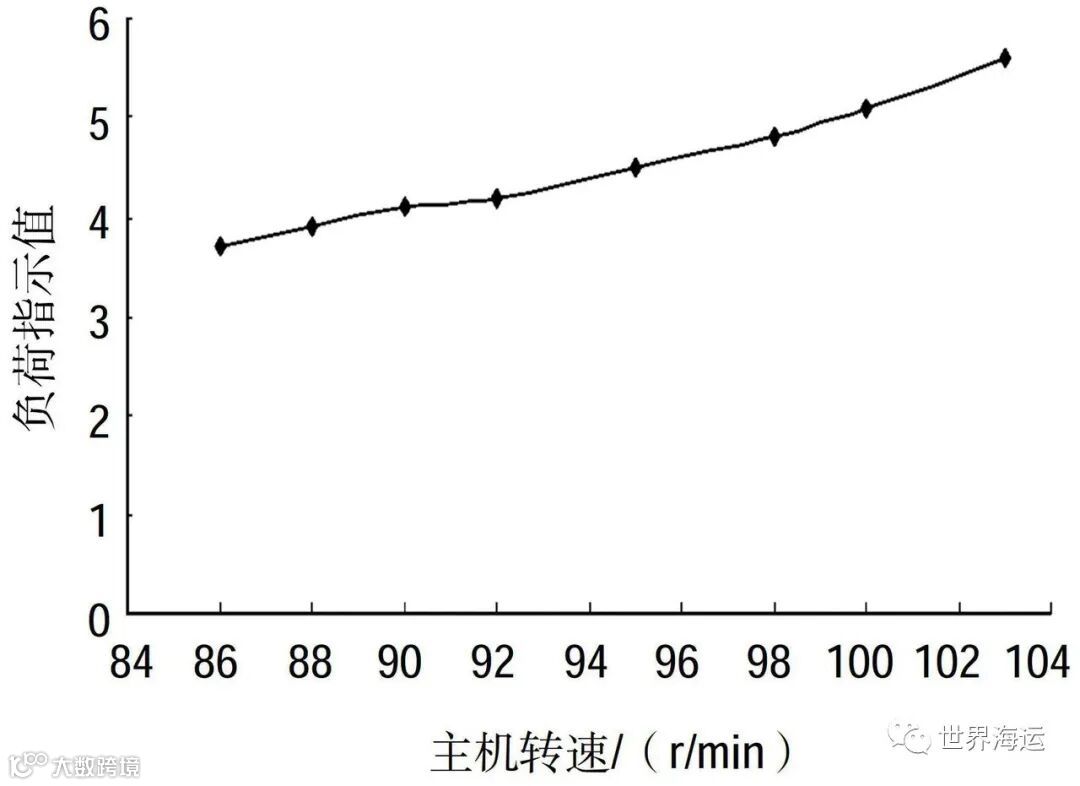 实测船舶是一艘1993年出厂的多用途船舶,设计载重量22 000吨。该航次 ( 105航次 ) 计划装载18 507吨杂货,于2014年7月20日从韩国马山港 ( MASAN ) 过太平洋,经巴拿马运河到科隆港和美国港口卸货。主机最大持续转速是109转/分,公司告知船舶主机以88转/分的经济航速运转,但没有告知理论依据。在船舶离港引航员离船后开始测量工作,此时船舶一般航行于港口外海,水域比较开阔,水深比较大,兴波阻力等因素对船舶的影响比较小,基本上和船舶在大洋中航行的环境一致。船舶会由港速慢慢加速至海速,利用加速过程进行数据的测取不影响船舶的正常营运。船舶在加速和航行过程中实际航速总是变化的,为了有效降低航速测取的误差,直接使用理论航速代替实际航速。因为在外界条件不变的情况下,滑失率是一个定值,理论航速与实际航速成正比,也就是“实际航速=理论航速× ( 1-滑失率 )”。随着船舶慢慢加速,主机转速达到85转/分左右时主机辅助鼓风机自动停止,此时开始正式测量程序。油门刻度值变化大些便于读取,为节省时间并减少人为读数误差,按每次两转或三转加速,从86转/分逐步加到103转/分。转速稳定后,记录下主机转速对应的油门指示刻度,用EXCEL的图表功能绘出负荷指示曲线 ( 如图1所示 )。从中可以直观看出主机在转速90到92区间负荷变化比较平缓,船舶此航次的最低燃油费用转速应在92转/分左右。具体值需进一步测量才能确定,先暂时将主机加速到90转/分。