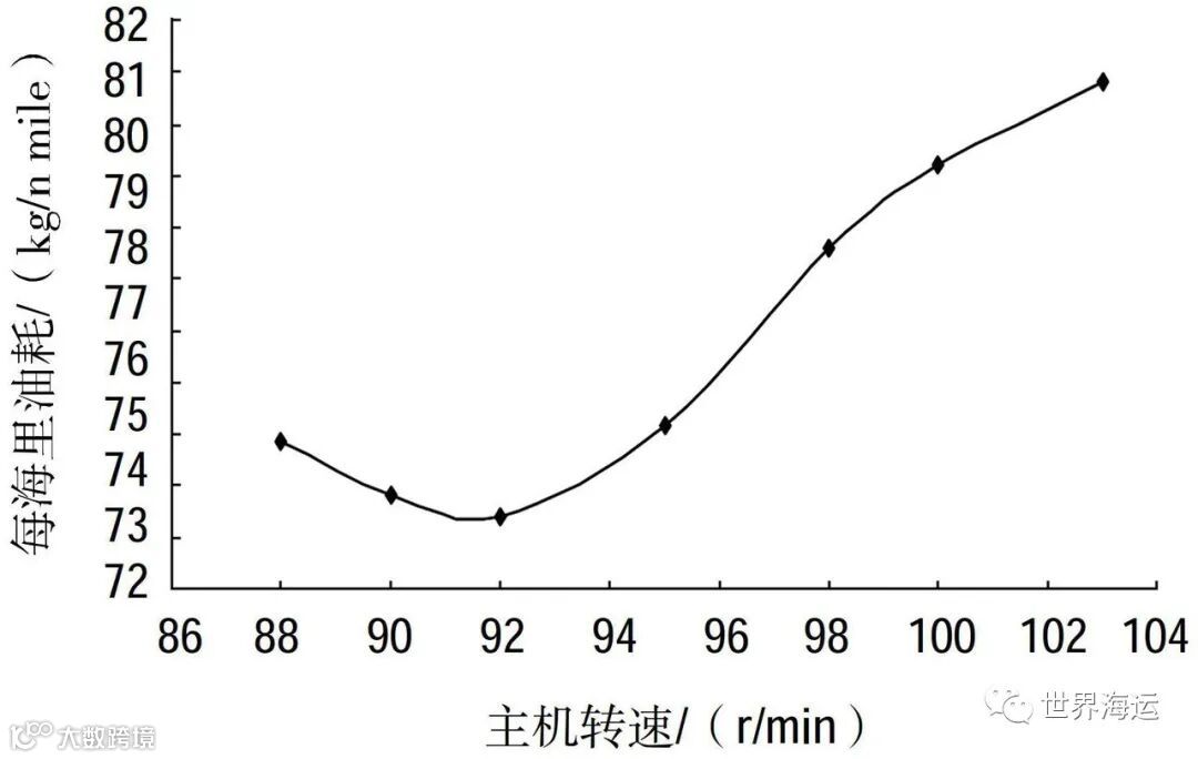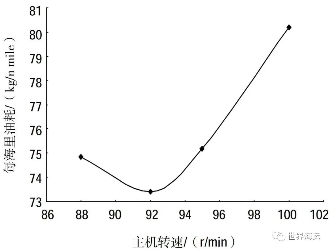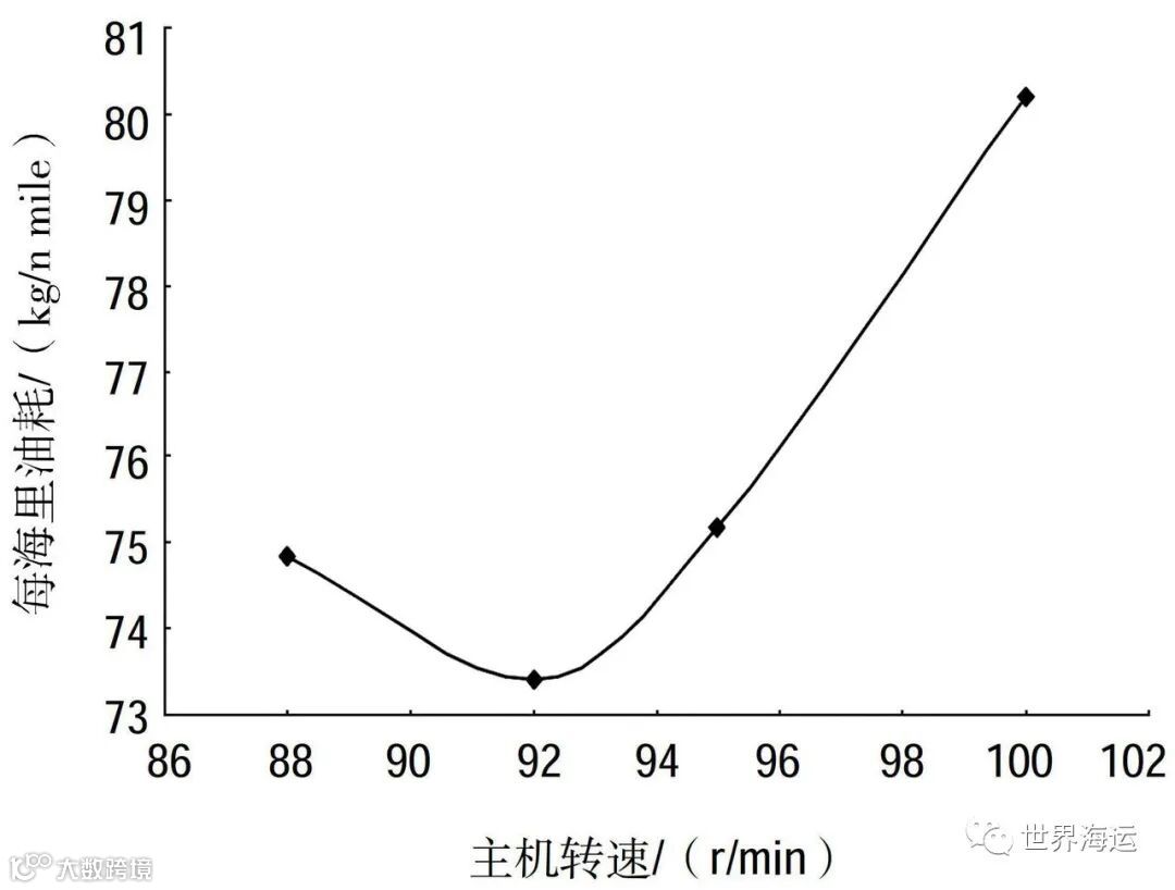 在第一次测量时不测量90转/分和98转/分时的数据,除了要快速得到最低燃油消耗的转速外,还可通过观察曲线变化的趋势是否连续来验证测量方法的正确性。图3表明该轮主机在91转/分或92转/分时的航速是本航次的经济航速,故将主机的转速设定在92转/分运转。如果主机负荷偏大,可将主机转速减到91转/分。
