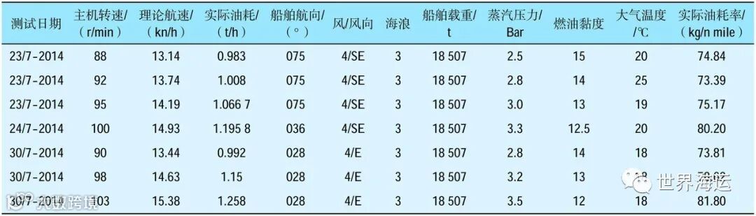 该航次横跨太平洋航行,整个航程主机基本上都以92转/分运转。船舶于2014年8月14日下午到达巴拿马锚地备车,从离开韩国马山港定速航行到抵达巴拿马备车为止,主机平均转速是91.6转/分,总距离是8 170海里,船舶载重吨是18 507吨,主副机总耗油为633吨;计算实际耗油结果是 4.186 4克/吨海里。查阅该轮103航次报告,其航程是从中国泰州港横跨太平洋到巴拿马,同样走大圆航线,总距离是8 860海里,载重吨是14 876吨,整个航程主机平均转速是88.9转/分,主副机总耗油是693.1吨,计算实际油耗结果是5.258 6克/吨海里。105航次的油耗要低很多,如果按照103航次的实际耗油率,105航次总的实际油耗是795.1吨,节省燃油162.1吨,效果明显。如果忽略载重吨位这个影响船舶成本较大的因素,只考虑油耗率和里程,105航次的实际油耗率是77.478 5千克/海里,103航次的实际油耗率是78.227 9千克/海里。按照103航次的油耗率,105航次的实际油耗应为639.1吨。这样粗略的计算也可表明105航次节省了6.1吨燃油。