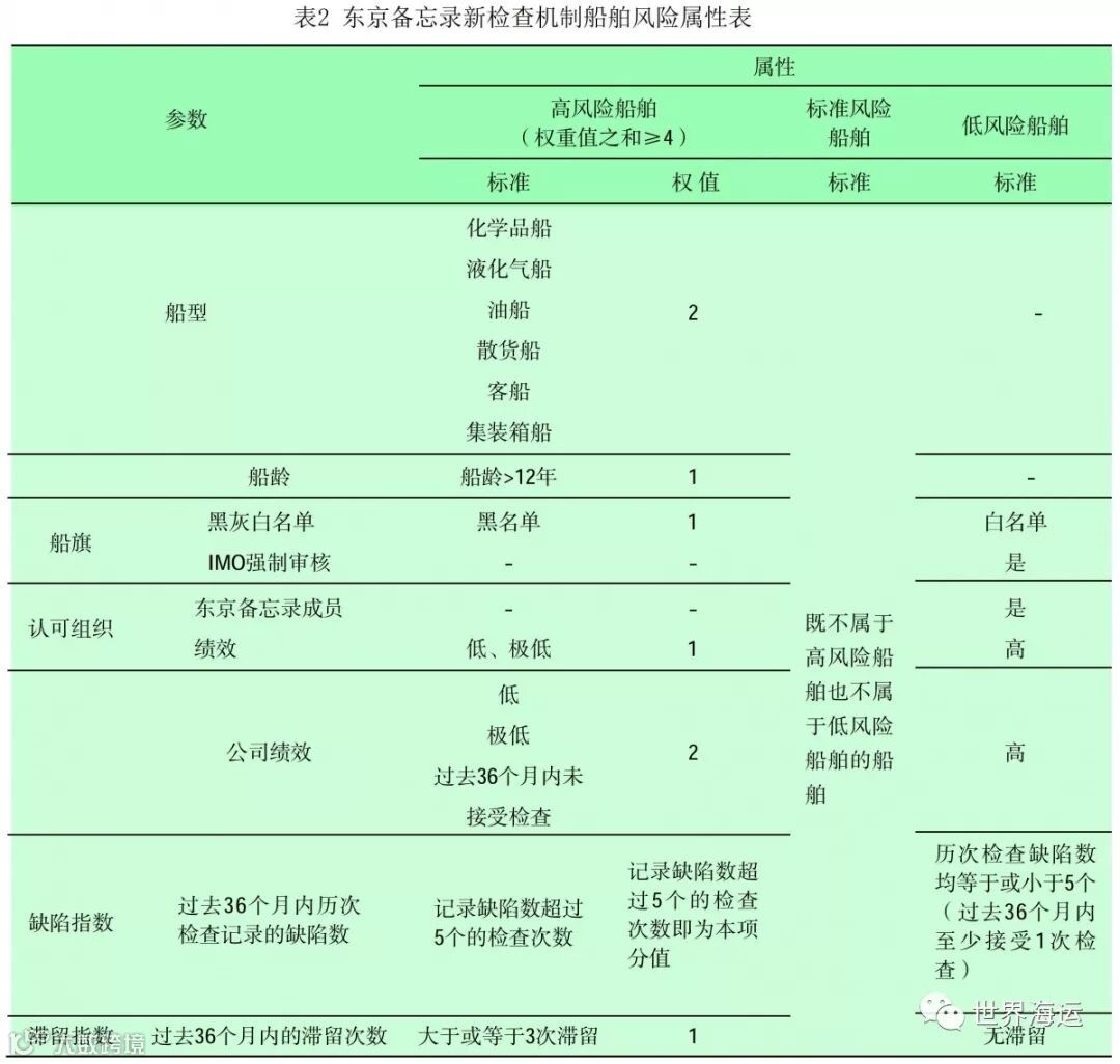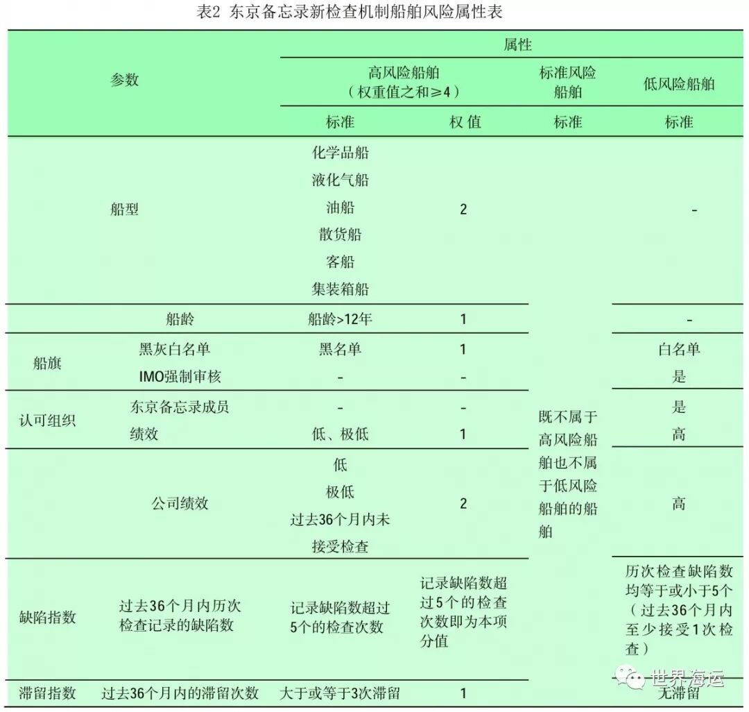 对于遗留缺陷,按东京备忘录原检查机制,在评估船舶风险属性时,每个遗留缺陷加2分,因此,如果遗留缺陷不关闭的话,可能影响船舶风险属性。而根据2014年1月1日生效的新检查机制(NIR),评估船舶风险属性时,遗留缺陷不关闭的话不加分。因此,船舶未必在纠正遗留缺陷后,一定要申请复查关闭缺陷,可以在下一次PSC检查时,申请PSC检查官验证后关闭。东京备忘录新检查机制的船舶风险属性如表2所示。