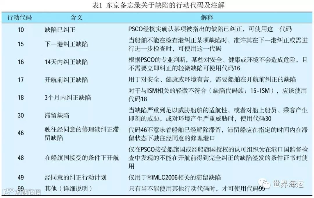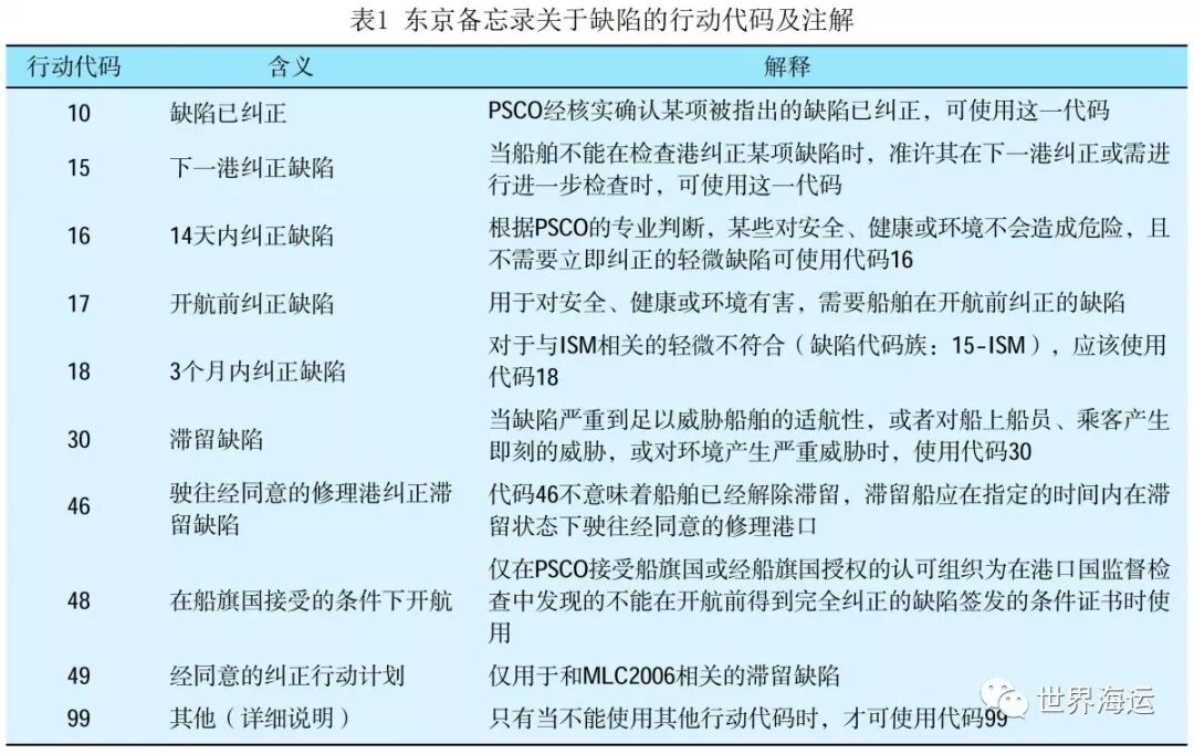 东京备忘录关于缺陷的行动代码共有10项,代码及注解如表1所示。