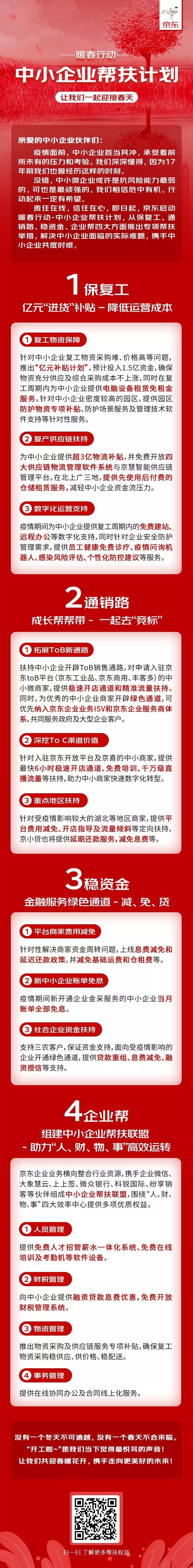 2月21日,京东启动“中小企业帮扶计划”,从保复工、通销路、稳资金、企业帮扶联盟四个维度推出13项帮扶举措,累计投入近5亿的资金资源补贴,直击中小企业的生存成长难题。