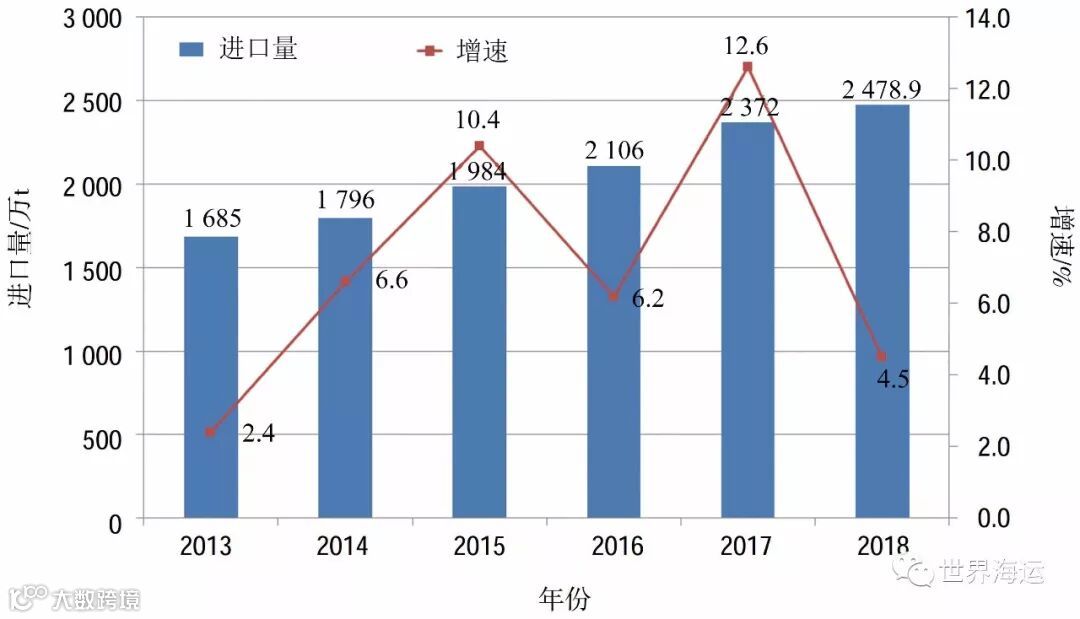 图5 2013—2018年中国纸浆进口量及增长情况