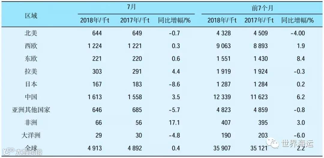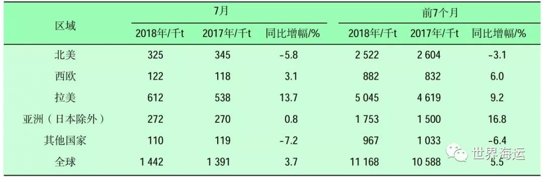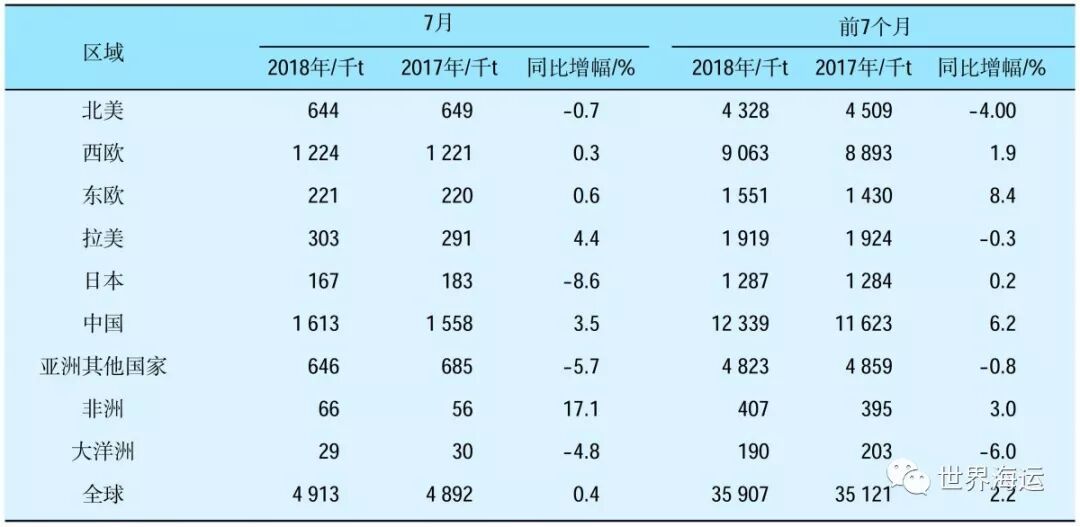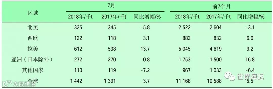 表1 2018年7月及前7个月全球主要纸浆进口区域进口量统计