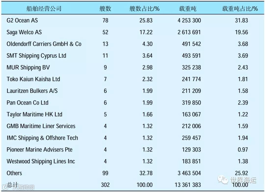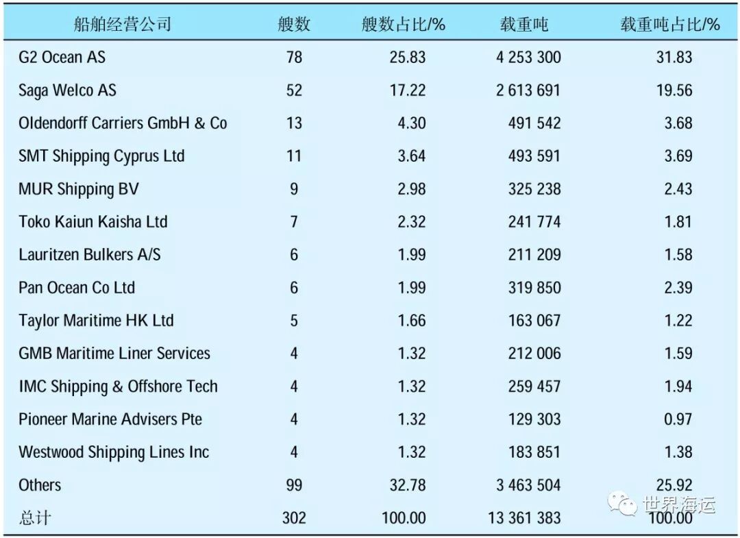 目前经营纸浆船的航运公司中规模最大的有两家,分别是G2 Ocean AS和Saga Welco,分别拥有纸浆船78艘(425.3万DWT)和52艘(261万DWT),占到全球船队总载重吨的31.8%和19.6%。此外还有德国的Oldendorff Carriers经营13艘、49.2万DWT,塞浦路斯SMT Shipping拥有11艘、49.4万DWT左右的纸浆船运力(表7为全球纸浆船公司运力情况)。