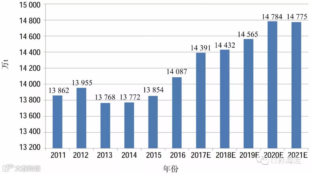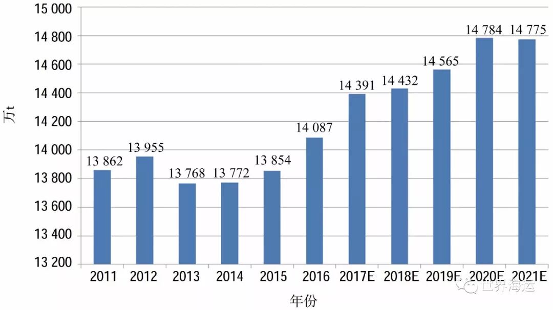近10年全球纸浆年产量和消费量基本保持在1.8亿吨左右水平,贸易量保持在5 000万吨以上水平,供需基本平衡。