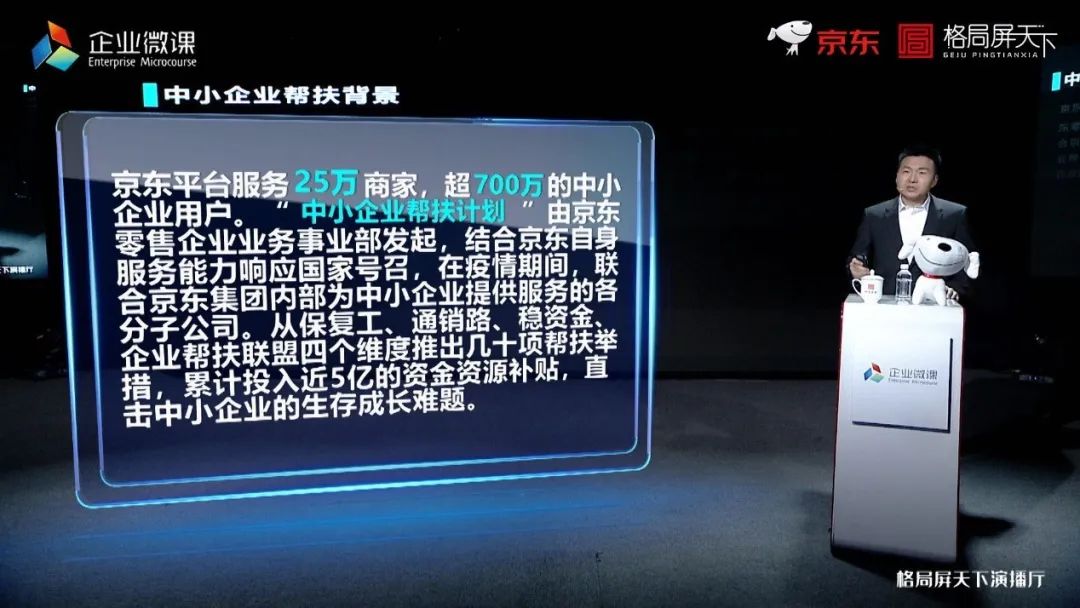 近日,京东应邀出席工信部企业微课直播平台,面向全国超2000万中小企业详细讲解京东中小企业帮扶计划的具体举措,以及如何通过数字技术打破中小企业帮扶的区域壁垒,帮助其走出当下困境,构建“抗疫能力”。