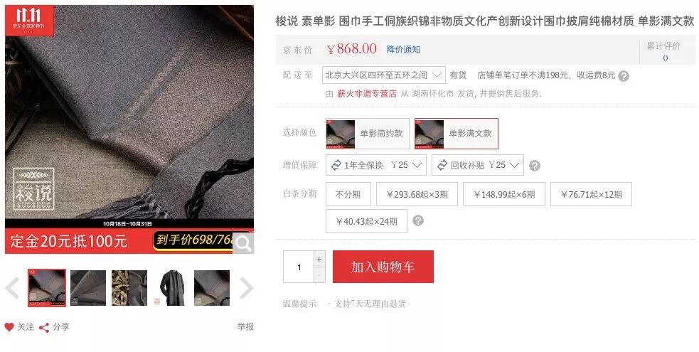 京东居家11.11期间,梭说品牌推出了素系列侗族手工围巾和侗锦领带,两个系列产品均由设计师与手工艺人共同设计完成后,交给湖南通道当地侗族织娘,使用传统侗棉工艺织就而成。素系列侗族手工围巾享受定金20抵100的优惠活动,最低只需698元就能将饱含民族文化风情的围巾带回家。侗锦领带则有定金20抵120的福利,到手价仅748元。