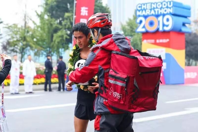 半程马拉松全程21.0975公里,终点设在天府国际金融中心。在万众跑友期待下,半程马拉松冠军于1小时14分11秒诞生了。本次京东物流用特别的方式迎接着2019成都马拉松半程前三名的到来,身穿快递工服的京东小哥亮相颁奖现场,为半程前三名跑者送上花环及奖牌。无论跑场内还是跑场外,每个最后一公里,都有京东小哥的身影。