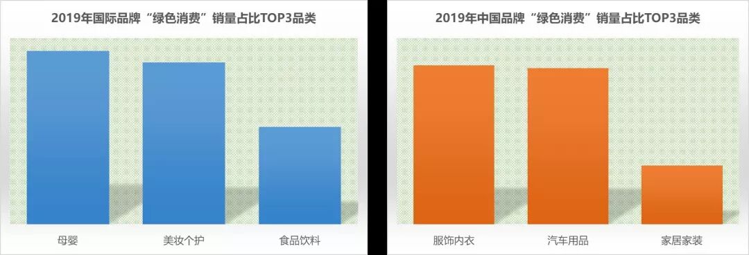 消费者在绿色化商品的品牌选择上,国际品牌锁定健康,中国品牌更加聚焦生活类商品。报告显示,国际品牌“绿色消费”商品销量占比较高的品类是母婴、美妆个护、食品饮料等快消品类。中国品牌则主要集中在服饰内衣、汽车用品和家居家装等品类。