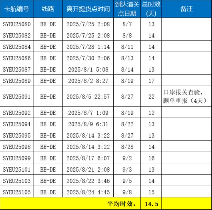 欧盟平均时效14.5天,除一车口岸查验22天(查验删单重报4天),其他所有车时效均在17天以内。