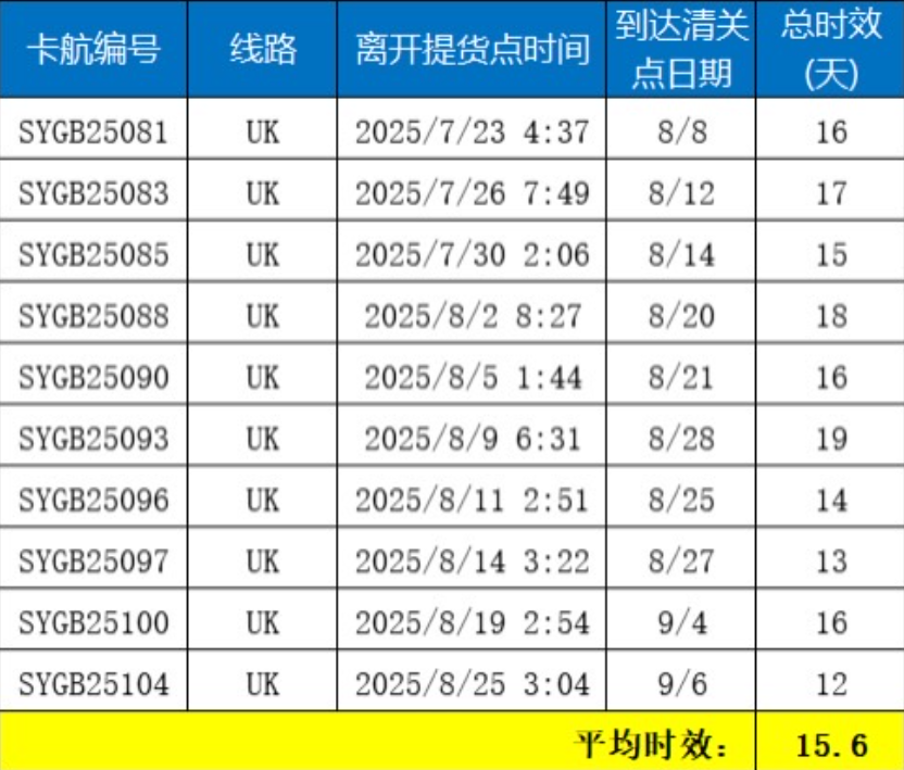 随附近期每车时效,英国平均时效15.6天,所有时效均在19天以内;