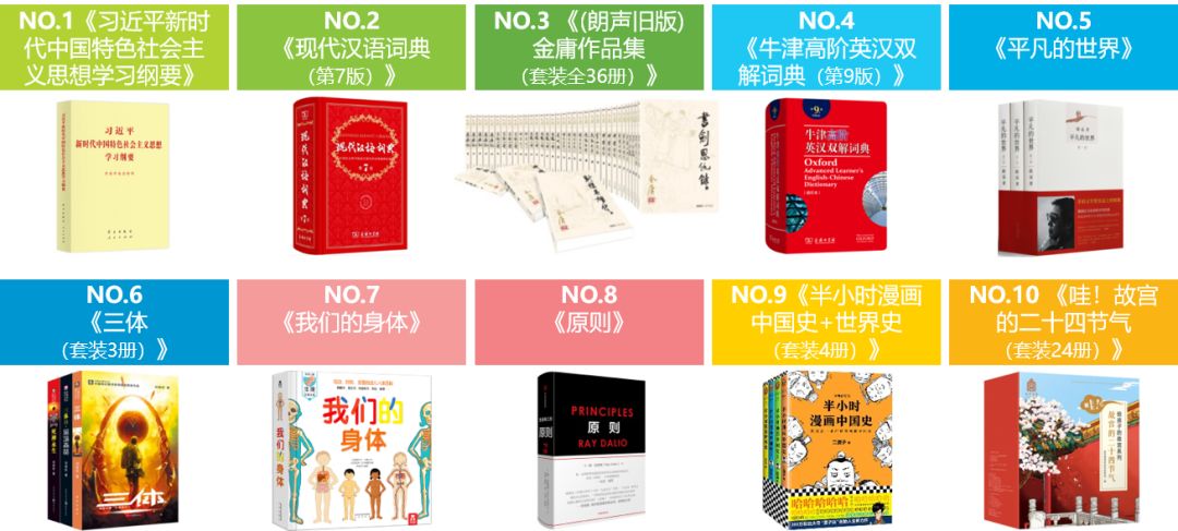受中小学语文教育改革、科技热浪持续升温等社会热点影响,中小学课外读物、科普百科类童书以及科幻文学等品类快速增长。年度榜单中,经典长销的《现代汉语词典》《平凡的世界》《三体》和《原则》连续两年上榜。